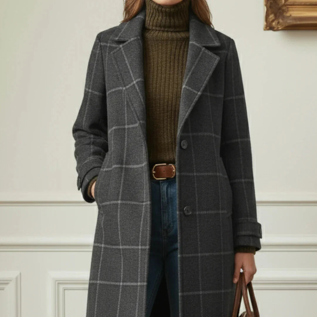 Abrigo clásico de cuadros con solapas estructuradas y silueta entallada. Elegante, atemporal y versátil, diseñado para elevar cualquier look de día o de noche con un estilo sofisticado y favorecedor.