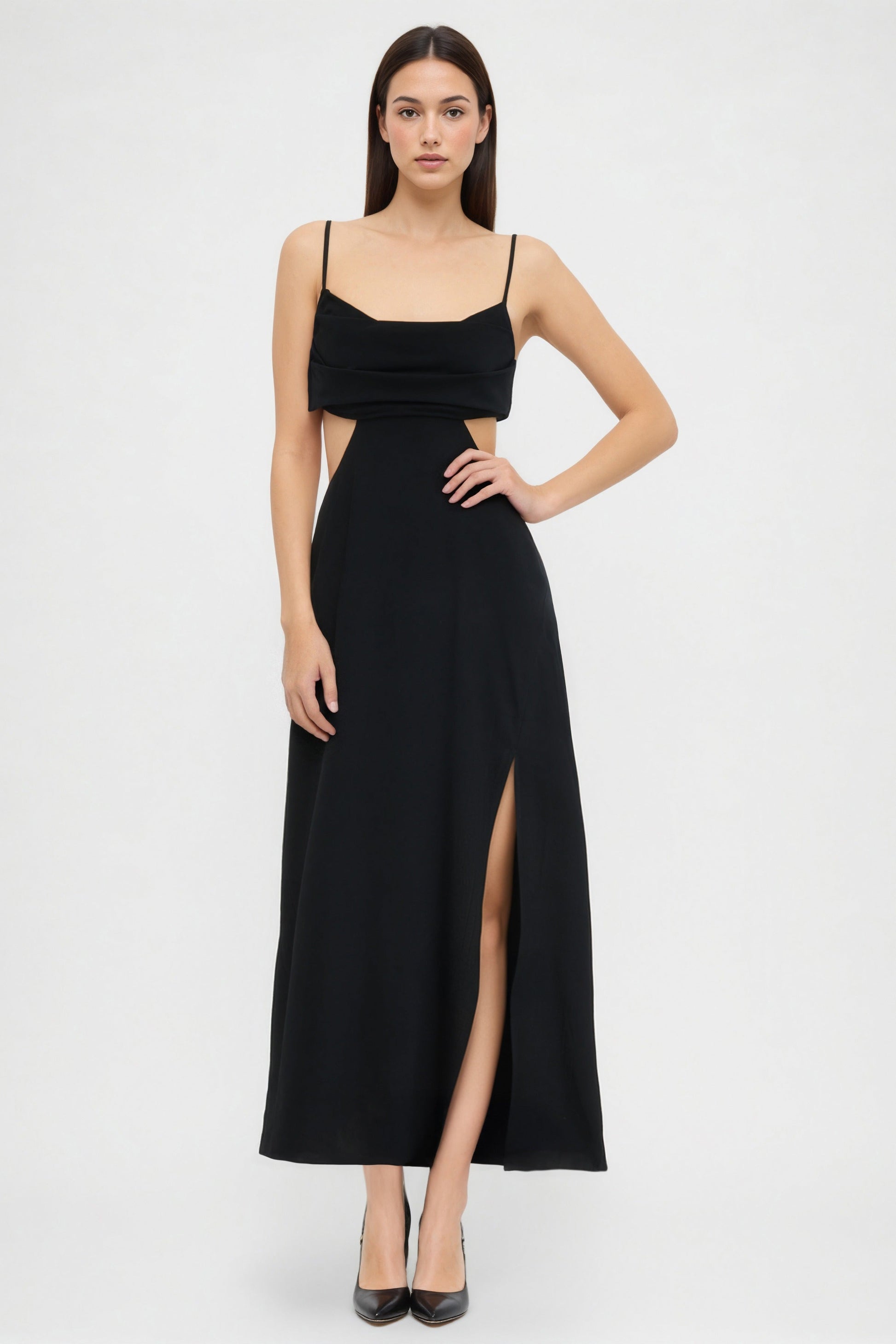 ALBA – Vestido Largo con Cut Out y Abertura Lateral en Negro Elegante